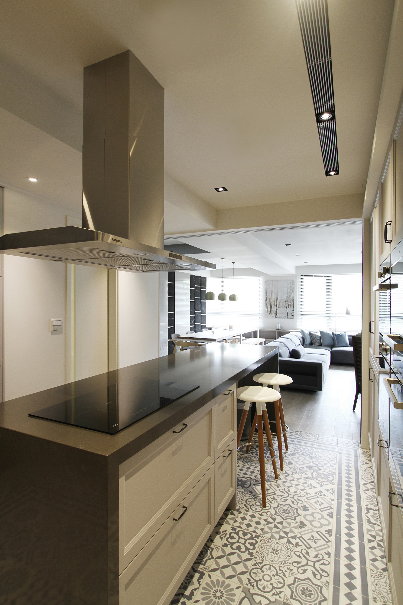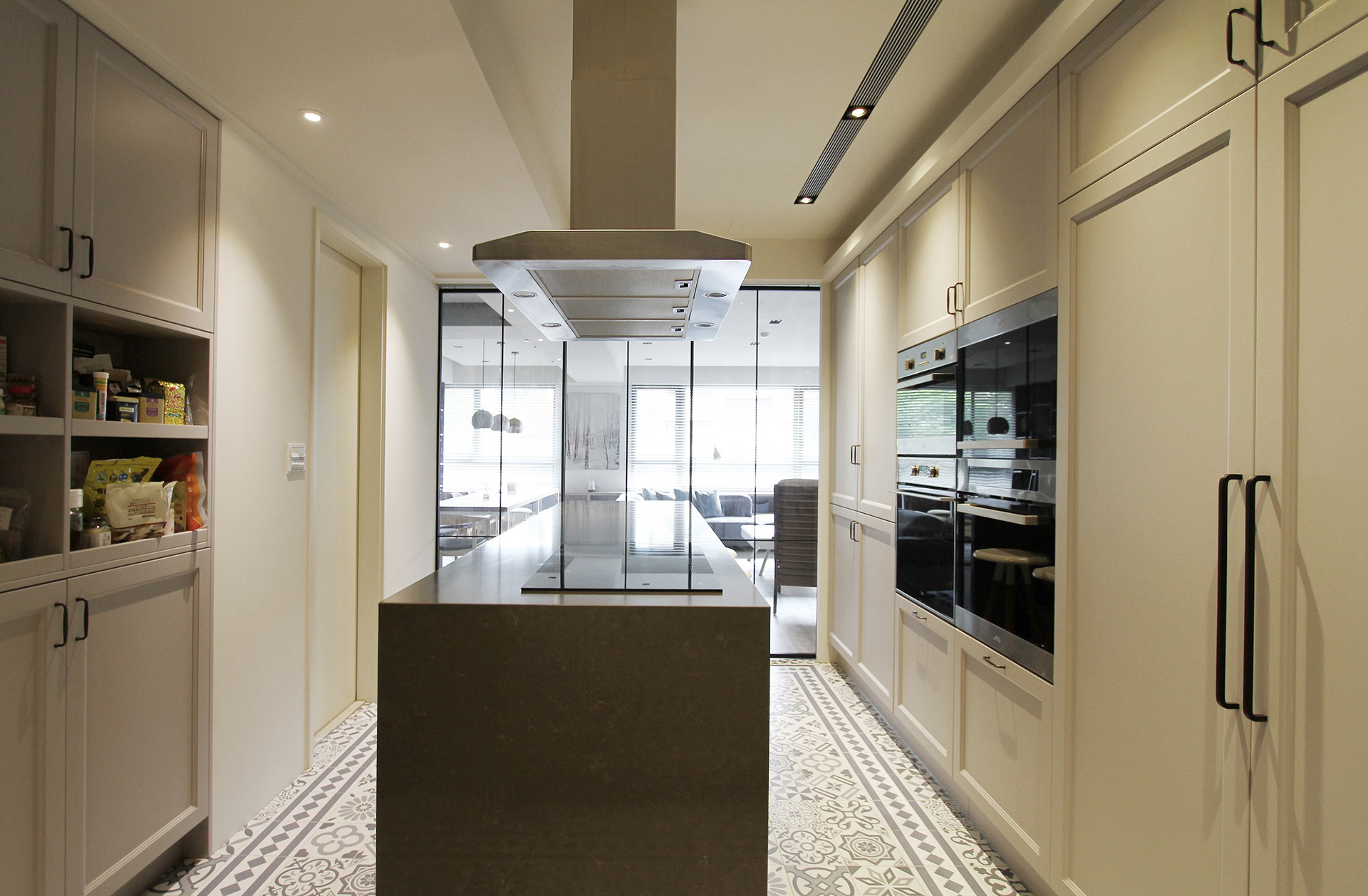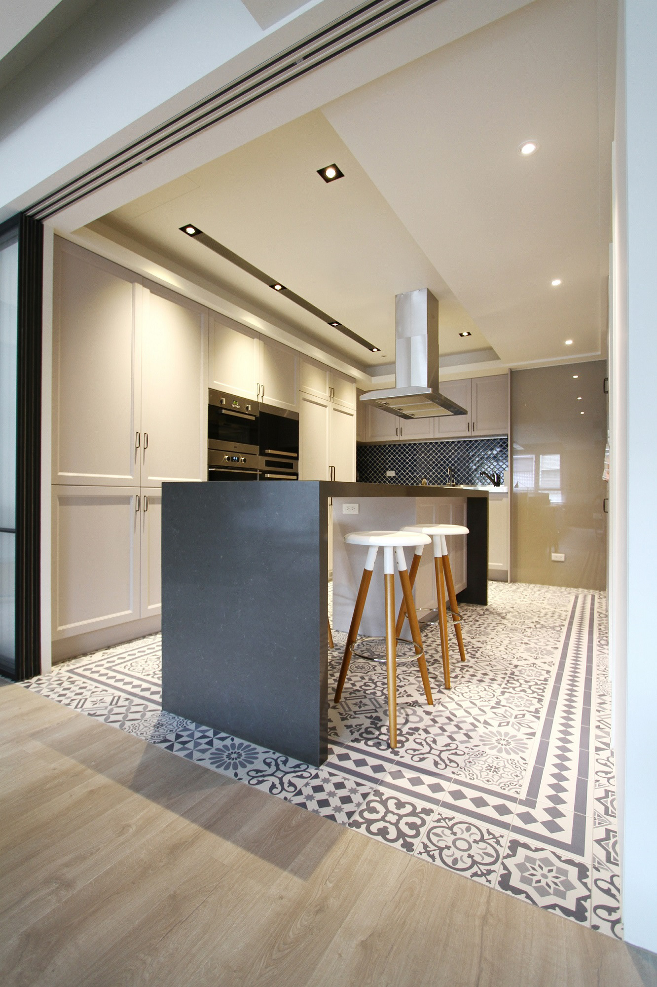 本案位於交通便捷的南京西路上,廚房空間採用開放式的設計手法,搭配美式鄉村的框型元素來做設計,在地板與牆面上並特別挑選復古花磚的方式,使得廚房空間更具有溫馨的氛圍;為了兼顧油煙外散問題並使用拉門的方式來解決。 本案選用 檯面【西班牙賽麗石】【不鏽鋼】 門板【陶瓷烤漆】 五金【奧地利blum標準抽】 感謝【引域設計有限公司】團隊 共同配合完成。