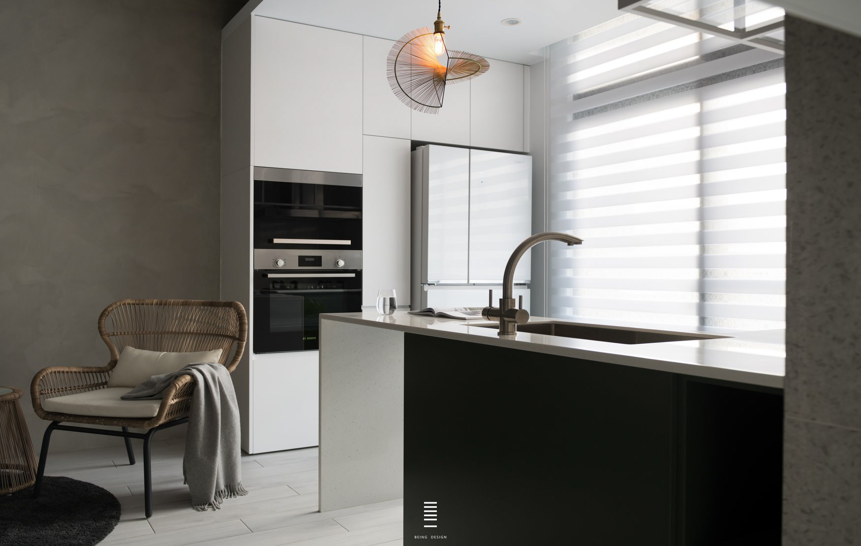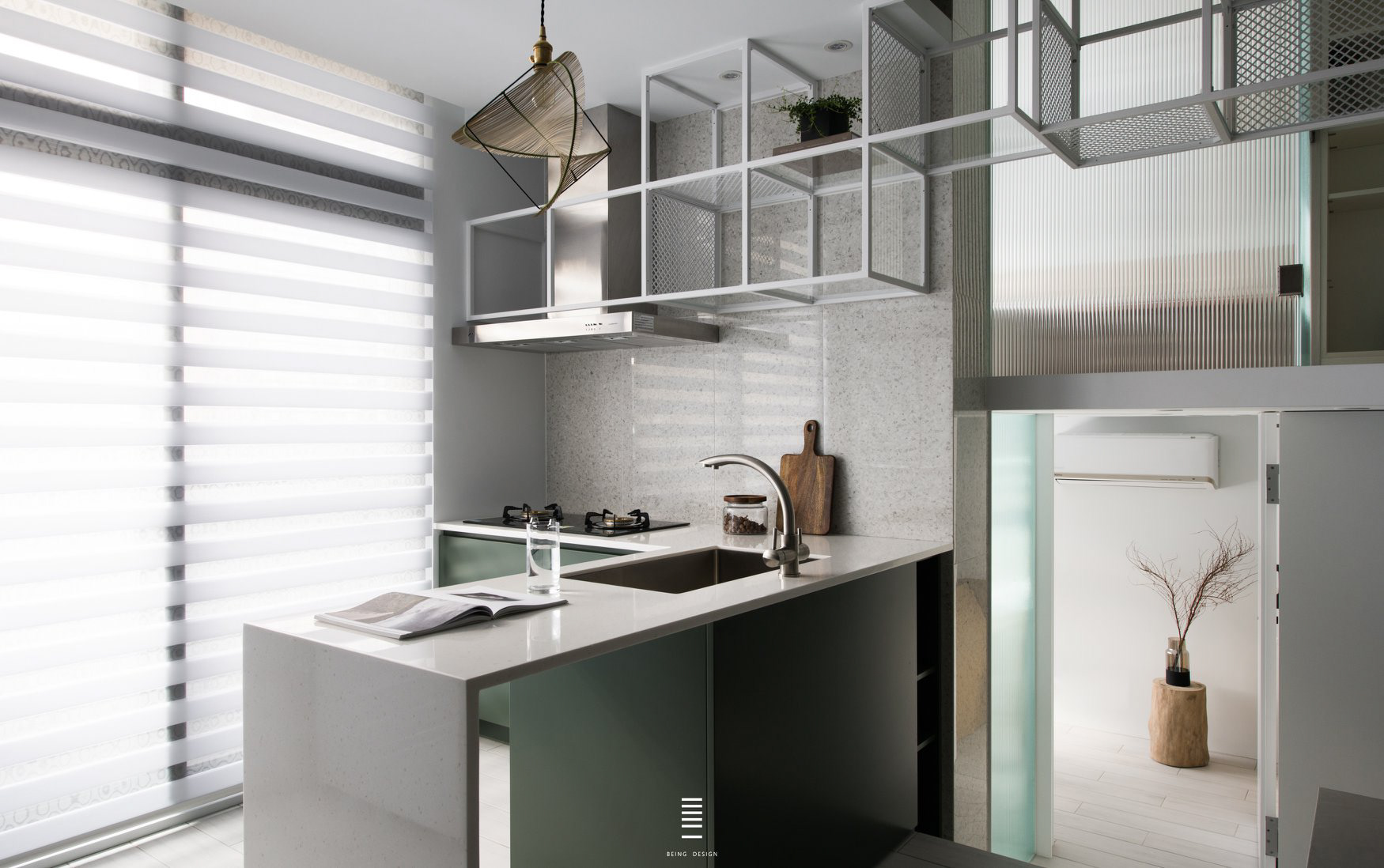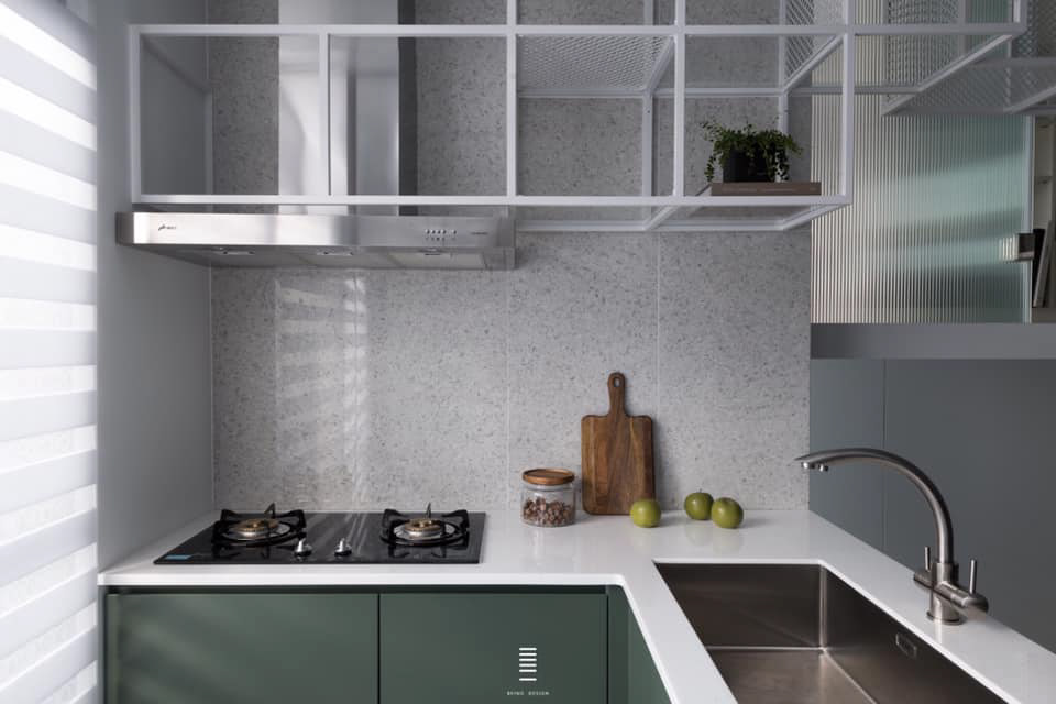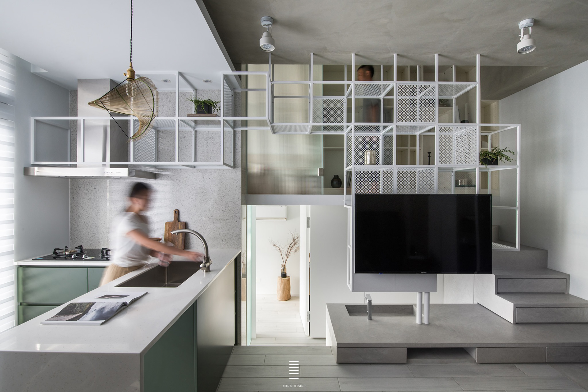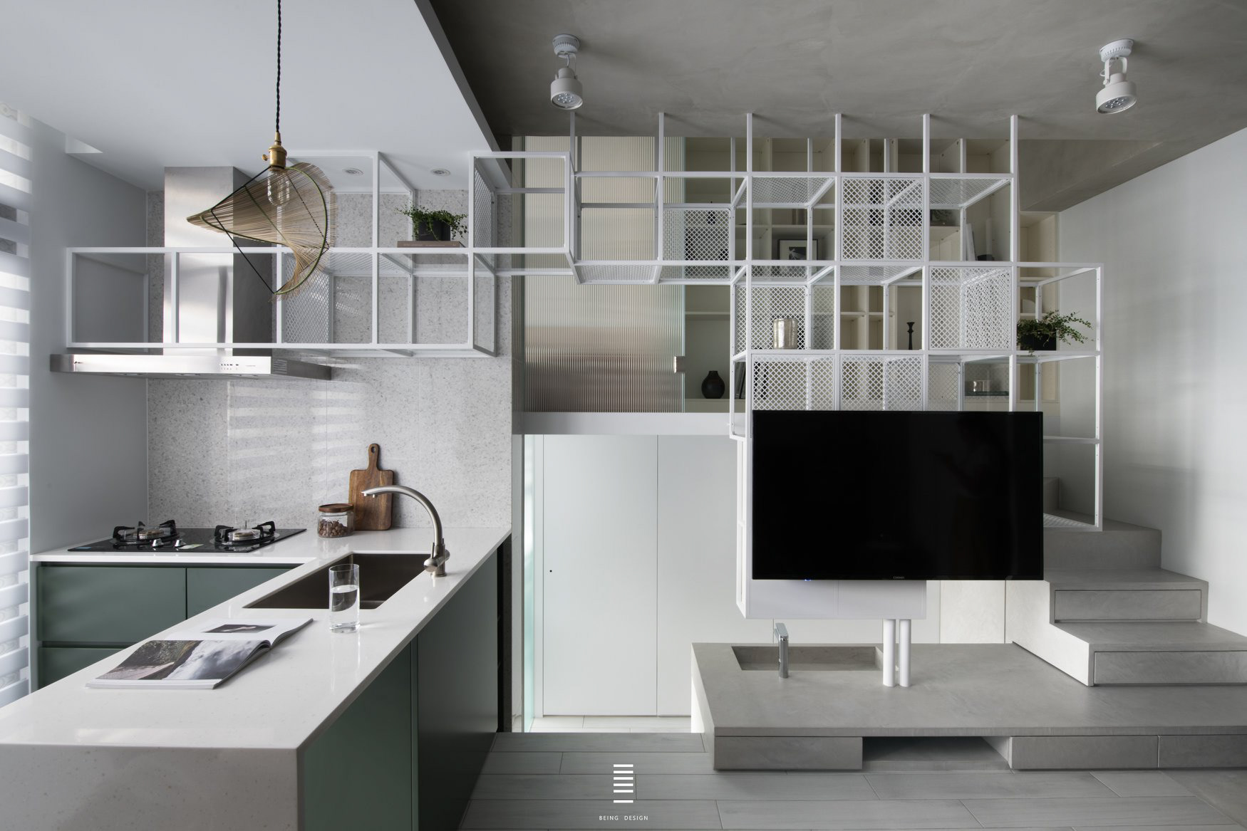 本案為總坪數13坪左右的毛胚屋,設計師運用其重疊所產生出的"交集空間",創造出空間中最大的視覺焦點。 使框架量體既是電視牆,同時也是樓梯扶手、造型展示架以及鏡櫃,並延伸進廚房空間,使開放式的廚房空間,能跟各個空間有所聯繫。 本案選用 檯面【韓國人造石】 門板【霧面烤漆】 五金【奧地利blum標準抽】 感謝【質覺制作設計有限公司】團隊 共同配合完成。