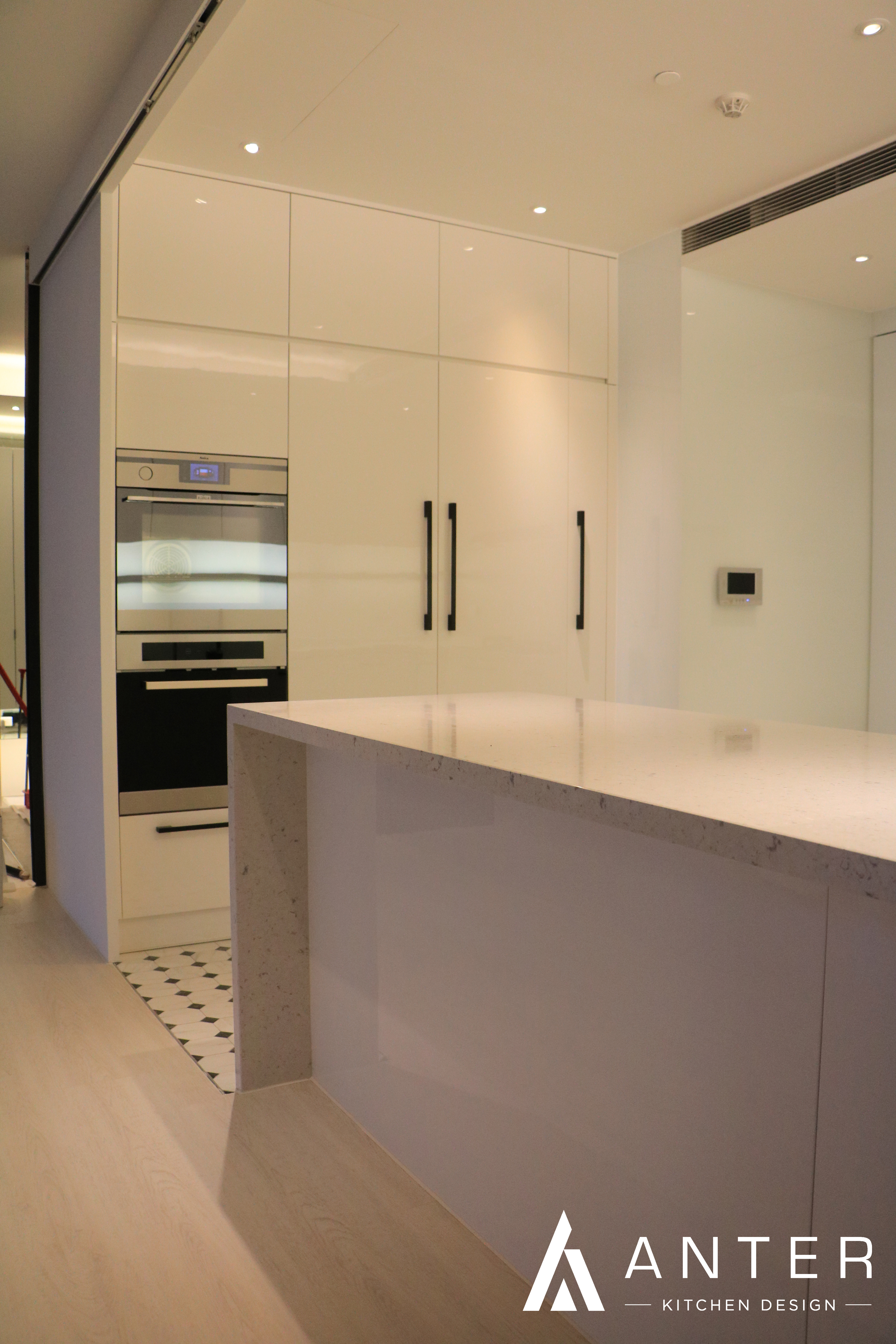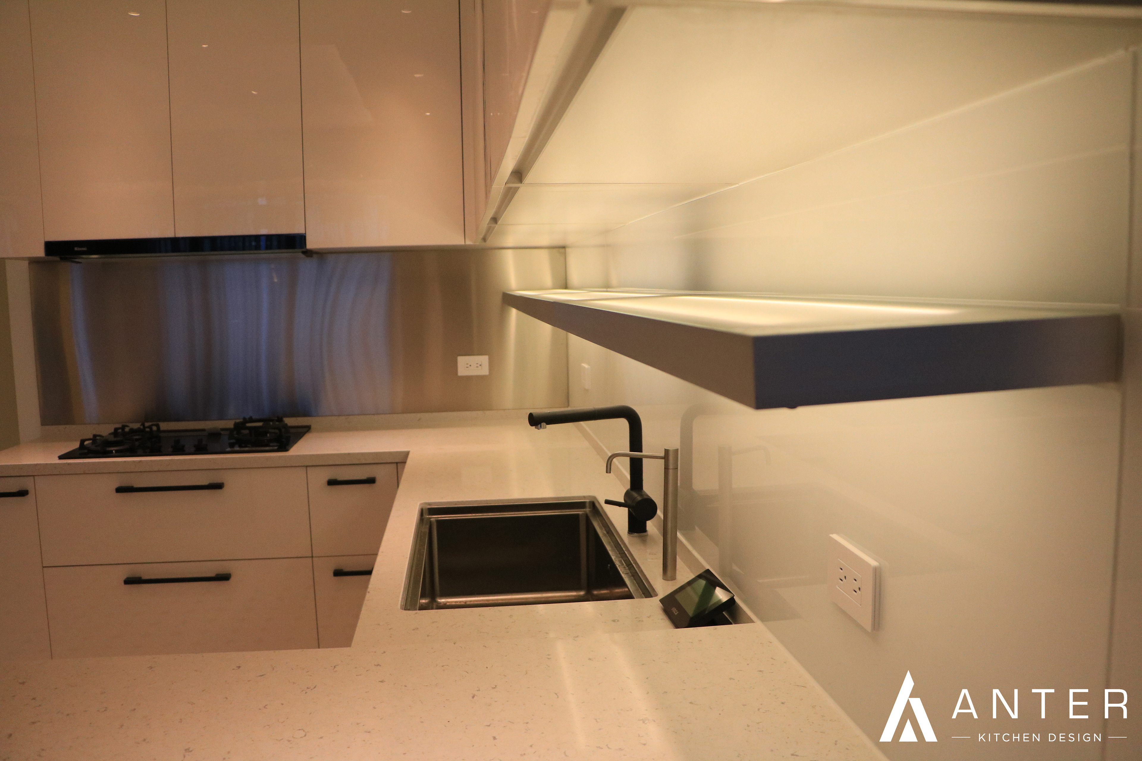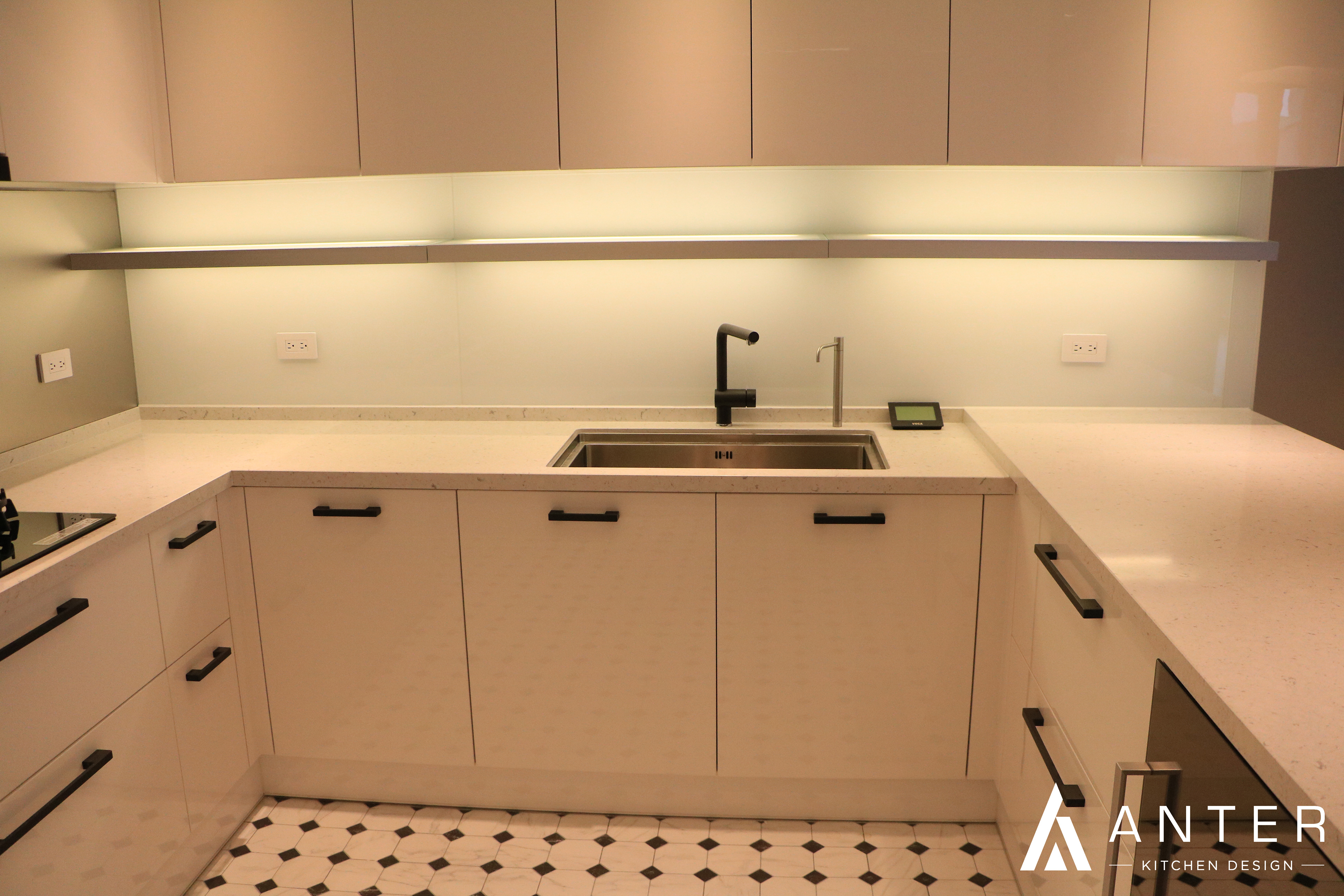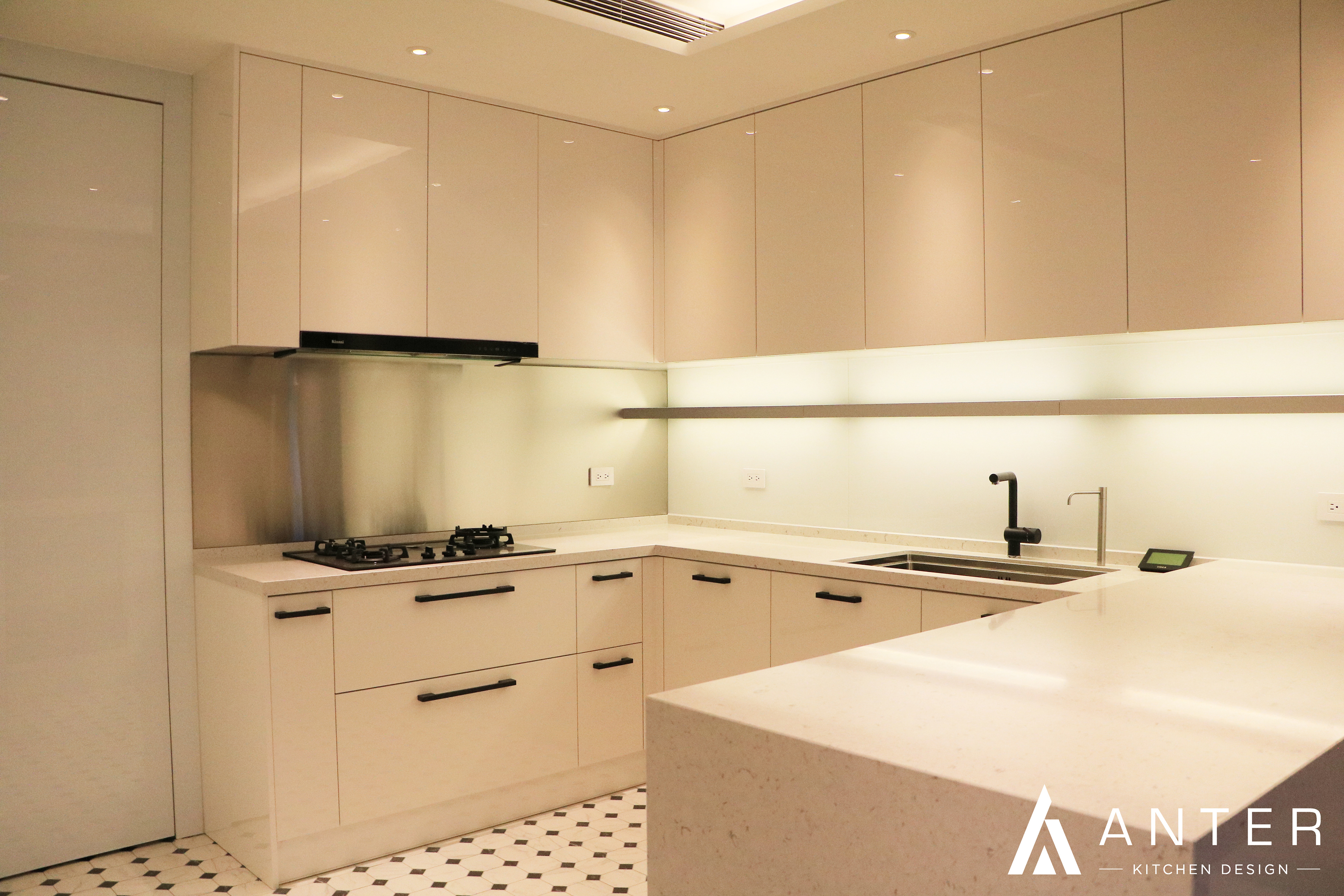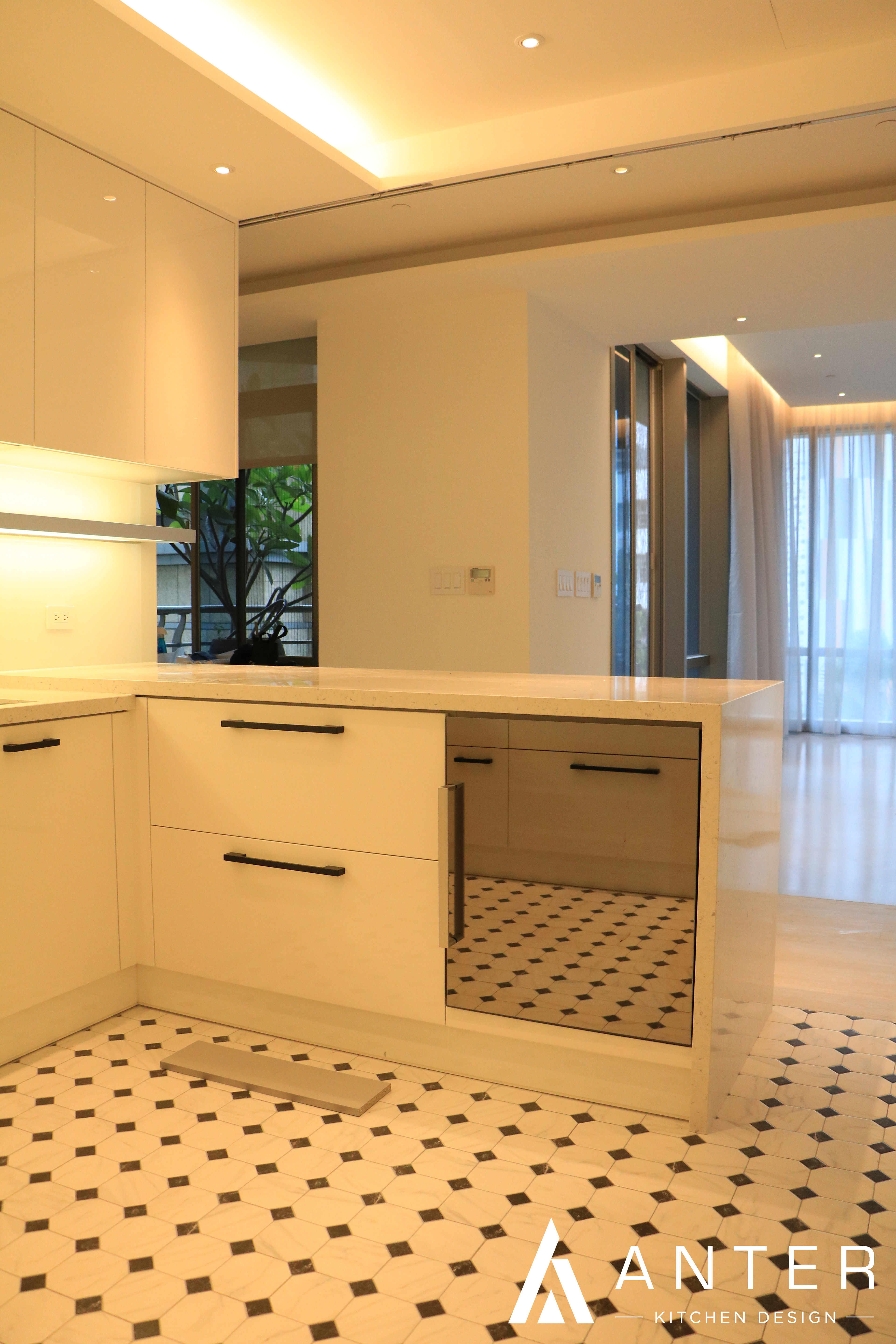 本案位於高樓林立的信義住宅區內,採用純白的設計手法,使空間看起來更加簡約明亮與寬敞,而在吊櫃也增加了層板燈的設計,點亮了整個開放式廚房的光線與亮點。 本案選用 檯面【西班牙賽麗石】 門板【結晶鋼烤】 五金【奧地利blum標準抽】