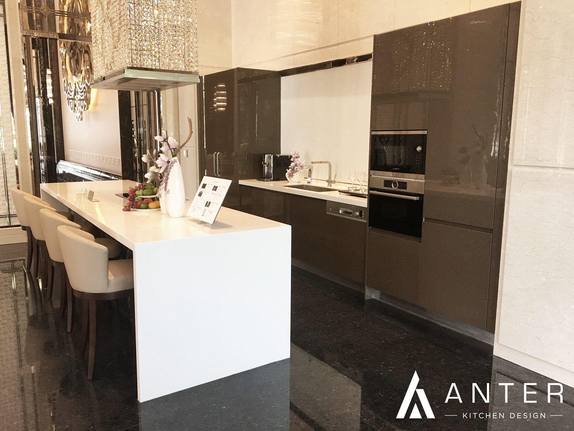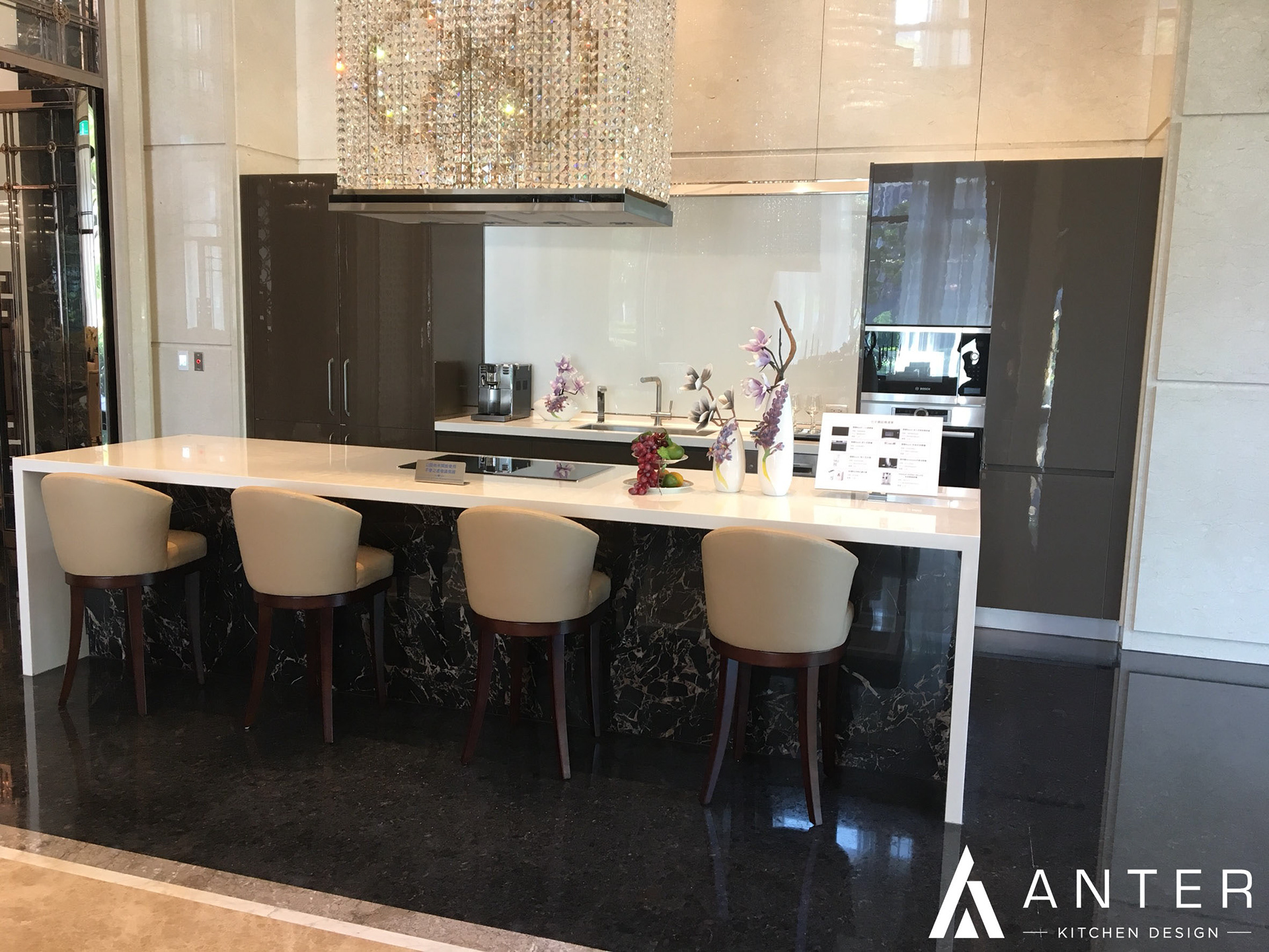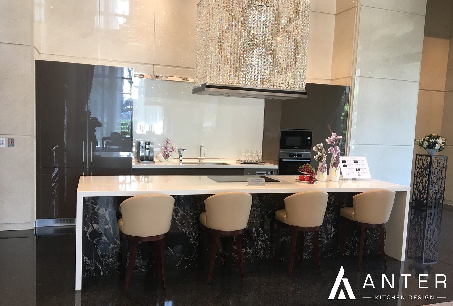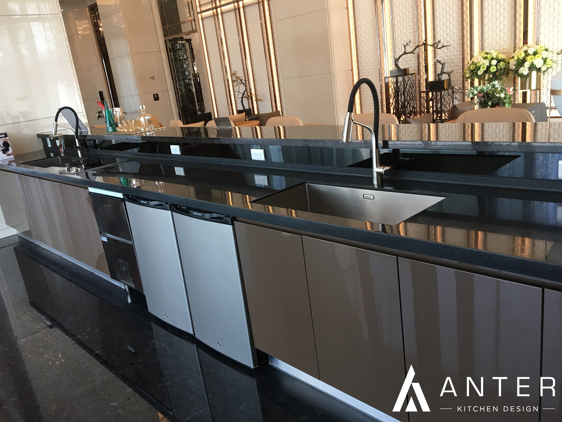 本案新莊副都心遠雄九五公設的部分包含1F的廚藝教室、吧檯 及 41F的備餐室、紅酒吧 與 42F的吧檯;而位於1F廚藝教室挑高的設計,中間搭配懸吊五米長的中島油機,外包覆著水晶垂簾,使此空間更能感受到華麗氣派的氛圍。 本案選用 檯面【美國杜邦人造石 】 門板【結晶鋼烤】 五金【奧地利blum標準抽】